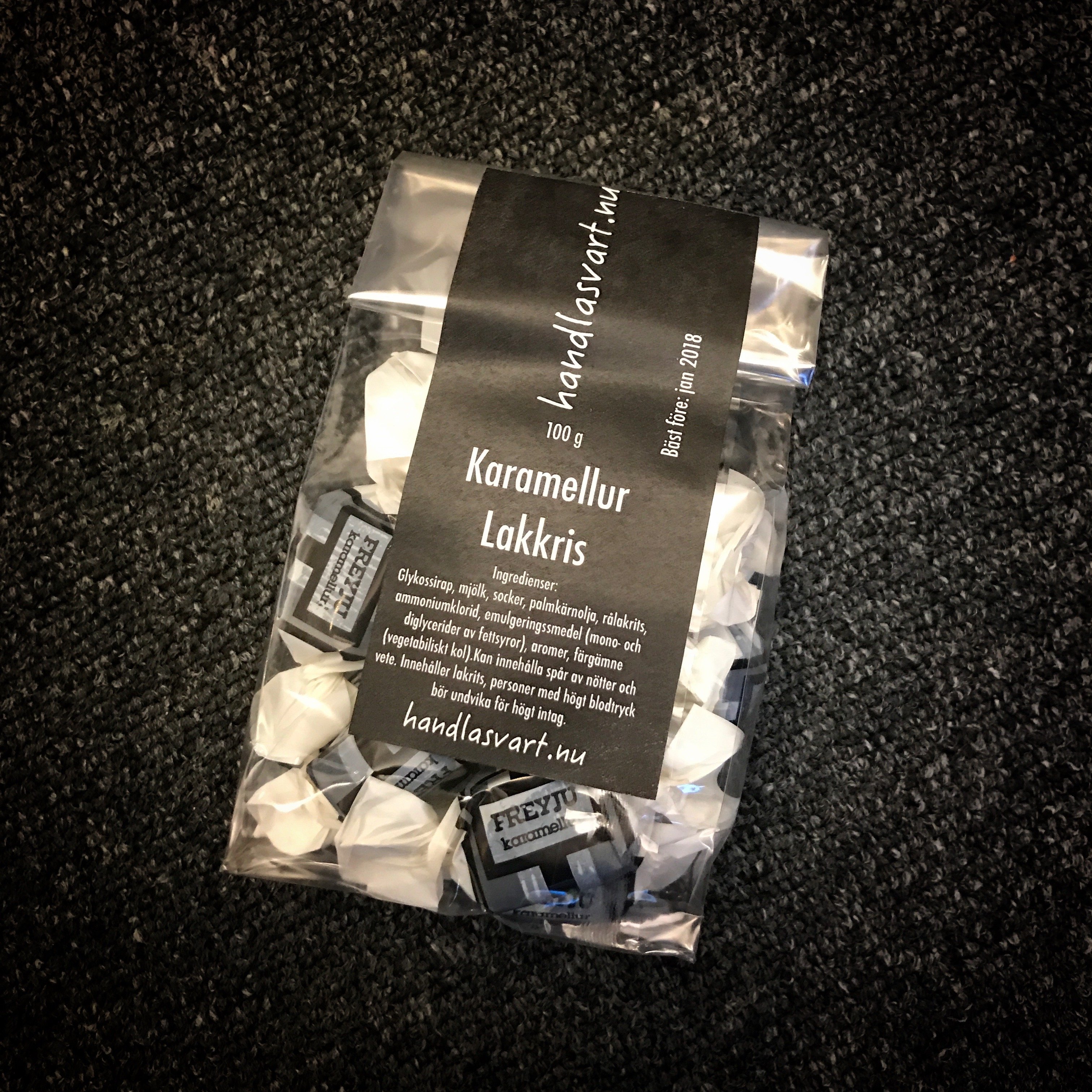 Glykossirap, mjölk, socker, palmkärnolja, rålakrits, ammoniumklorid, emulgeringssmedel (mono- och diglycerider av fettsyror), aromer, färgämne (vegetabiliskt kol).Kan innehålla spår av nötter och vete. Innehåller lakrits, personer med högt blodtryck bör undvika för högt intag.